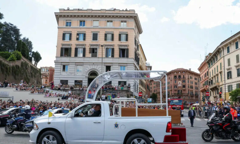 Με ήχους από σειρήνες αστυνομικών οχημάτων, η πομπή ξεκίνησε από το Βατικανό και διέσχισε τους δρόμους της Ρώμης, με προορισμό τη Βασιλική της Santa Maria Maggiore, όπου θα γίνει η ταφή του Πάπα.