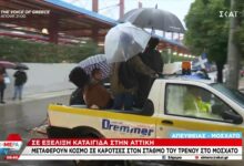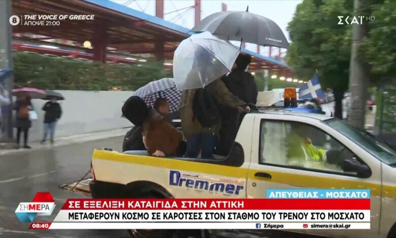 Μοσχάτο: Μετέφεραν σε… καρότσα τον κόσμο που ήθελε να πάει στον σταθμό του τρένου λόγω πλημμύρας – «Φούσκωσε» ο Κηφισός (video)