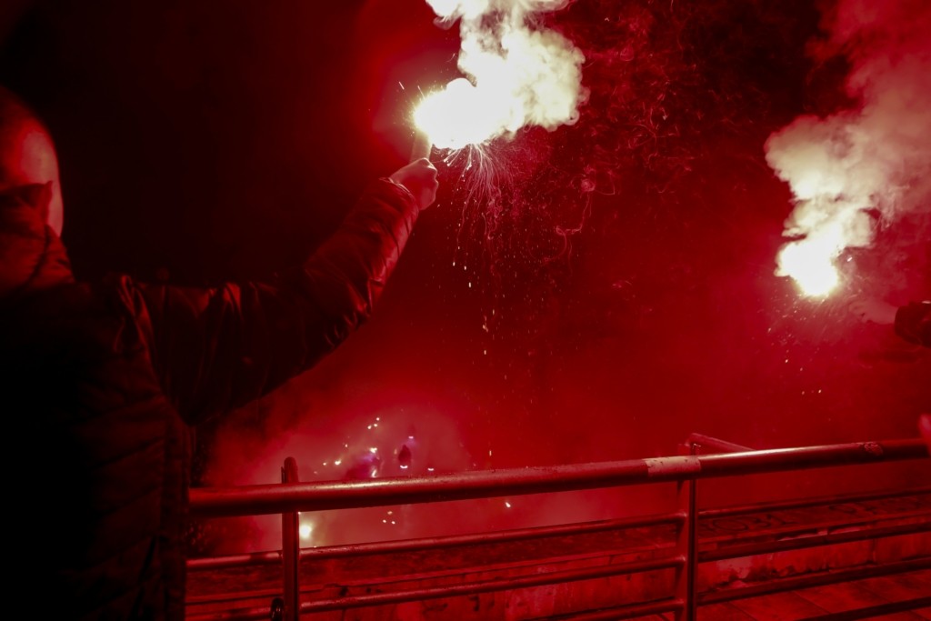 Πομπή αυτοκινήτων και μηχανών συνόδευσε τις επτά νεκροφόρες από το αεροδρόμιο Μακεδονίας στην Τούμπα. Ο ουρανός έγινε κόκκινος με τους οπαδούς του Δικεφάλου του Βορρά να ανάβουν πυρσούς στη μνήμη των αδελφών τους.