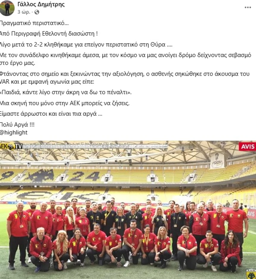 «Φτάνοντας στο σημείο και ξεκινώντας την αξιολόγηση, ο ασθενής σηκώθηκε στο άκουσμα του VAR και με εμφανή αγωνία μας είπε: “Παιδιά, κάντε λίγο στην άκρη να δω το πέναλτι” .Μια σκηνή που μόνο στην ΑΕΚ μπορείς να ζήσεις. Είμαστε άρρωστοι και είναι πια αργά … Πολύ Αργά !!!», ανέφερε χαρακτηριστικά ο Δημήτρης Γάλλος, επικεφαλής της Ομάδας Διασωστών της ΑΕΚ.