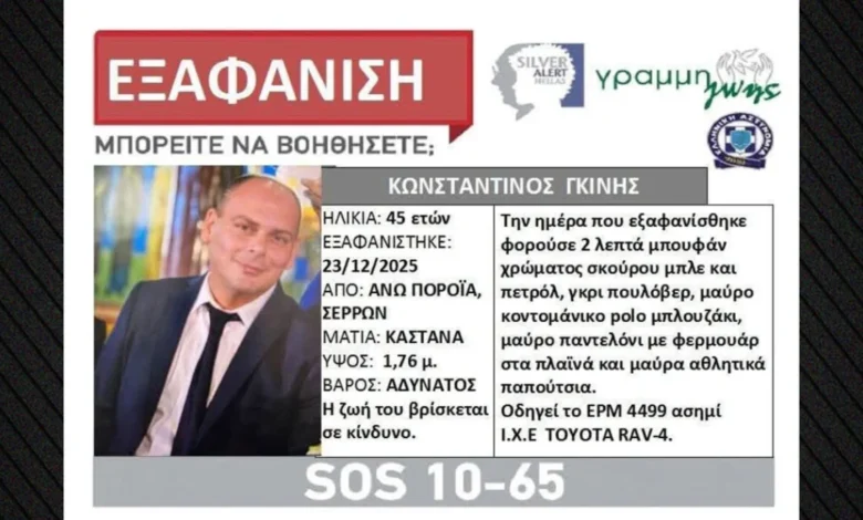 Οι έρευνες επικεντρώνονται τόσο στον εντοπισμό του ίδιου του 45χρονου όσο και του οχήματός του, με τις Αρχές να εξετάζουν όλα τα ενδεχόμενα, χωρίς μέχρι στιγμής να αποκλείεται κανένα σενάριο.