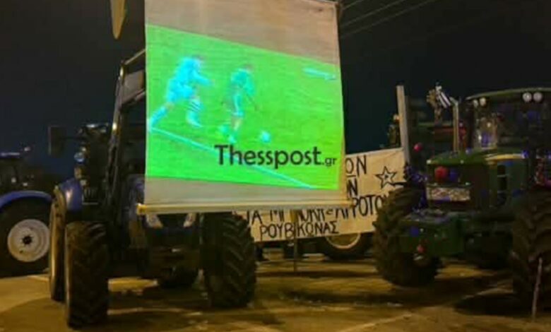 Αγρότες στο μπλόκο των «Πράσινων Φαναριών» έστησαν προτζέκτορα και οθόνη σε τρακτέρ για να δουν τον ΠΑΟΚ (Video)