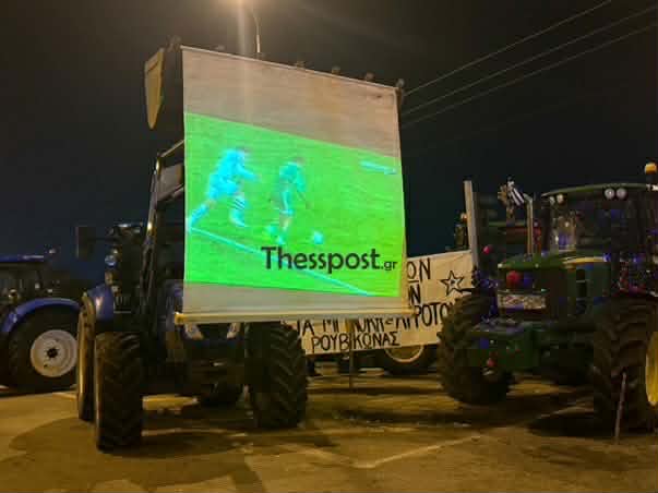 Όπως φαίνεται σε βίντεο και φωτογραφίες του ΤhessPost.gr, με τη χρήση προτζέκτορα και οθόνης προβολής που τοποθετήθηκε σε τρακτέρ, οι αγρότες κατάφεραν να παρακολουθήσουν την αναμέτρηση των δύο ομάδων.