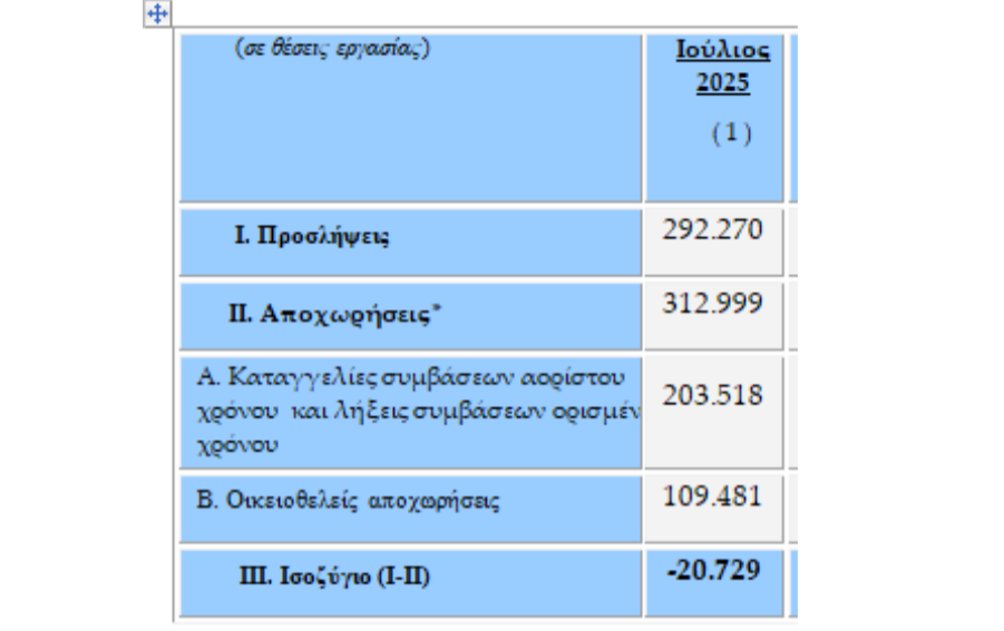 Πιο συγκεκριμένα, τον Ιούλιο 2025, -οι προσλήψεις ανήλθαν σε 292.270 ενώ οι απολύσεις σε 312.999, δηλαδή είχαμε 20.729 περισσότερες απολύσεις από προσλήψεις. Το στοιχείο αυτό δύσκολα μπορεί να ερμηνευθεί αφού ο Ιούλιος είναι μήνας που δεν δικαιολογεί απολύσεις και οι επιχειρήσεις (κυρίως του τουρισμού και της εστίασης) δηλώνουν καθημερινά ότι έχουν έλλειψη προσωπικού.