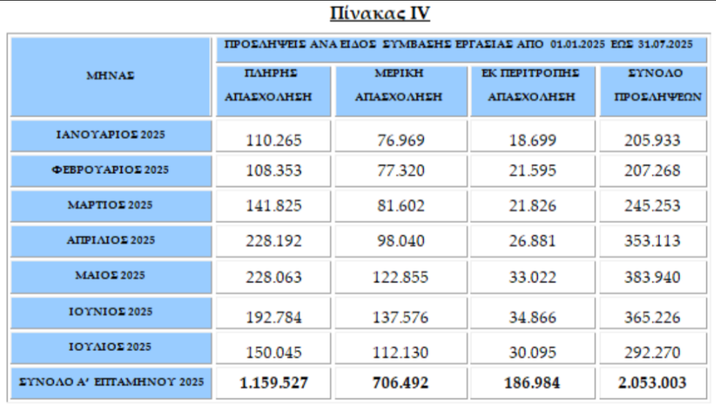 Επιπροσθέτως, από τον Πίνακα VI (σελ. 9), προκύπτει ότι 4.205 συμβάσεις πλήρους απασχόλησης (3.288 + 874 + 43) μετατράπηκαν σε μερική και σε εκ περιτροπής, ΜΟΝΟ κατά τον Ιούλιο 2025.