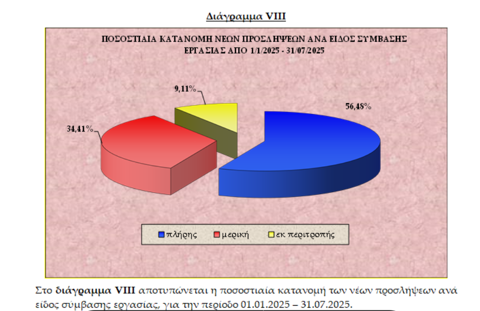 Σε επίπεδο επταμήνου 2025 (Ιανουάριος-Ιούλιος), η μερική και η εκ περιτροπής απασχόληση ανέρχεται σε 43,52%, όπως φαίνεται και στο παρακάτω Διάγραμμα VIII (σελ. 8 Έκθεσης).