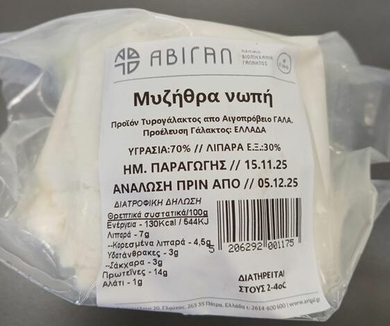 Οπως έκανε γνωστό, το προϊόν με ημερομηνία παραγωγής 15/11/25, ημερομηνία ανάλωσης έως τις 05/12/25, συσκευασίας καθαρού βάρους 400g, το οποίο παράγεται και συσκευάζεται στην Ελλάδα από την Α.ΒΙ.ΓΑΛ Α.Ε.-ΑΧΑΪΚΗ ΒΙΟΜΗΧΑΝΙΑ ΓΑΛΑΚΤΟΣ-ΕΜΠΟΡΙΑ ΕΙΔΩΝ ΣΟΥΠΕΡ ΜΑΡΚΕΤ-ΑΦΟΙ ΑΘ. ΠΑΝΤΕΛΗ & ΣΙΑ ΑΕ, εξετάστηκε από το Τμήμα Υγιεινής Τροφίμων, της Δ/νσης Κτηνιατρικού Κέντρου Αθηνών του ΥΠΑΑΤ και διαπιστώθηκε η παρουσία Σταφυλοκοκκικών Εντεροτοξινών τύπου SEA έως SEE.