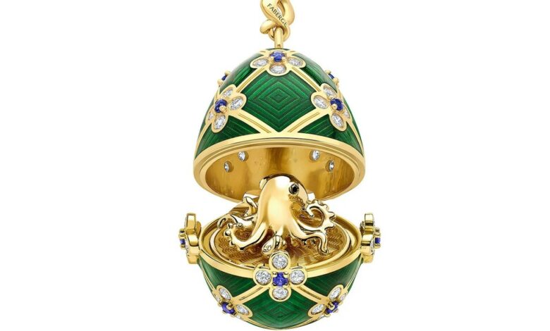 Το φερόμενο ως κλεμμένο αυγό Fabergé είναι διακοσμημένο με 60 λευκά διαμάντια και 15 μπλε ζαφείρια, σύμφωνα με την ιστοσελίδα του κοσμηματοπώλη, και ανοίγει αποκαλύπτοντας ένα μικροσκοπικό χταπόδι από χρυσό 18 καρατίων.