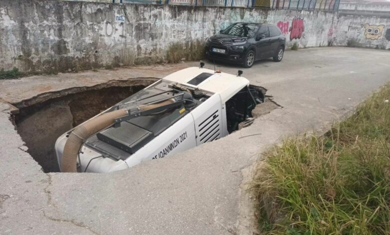 «Άνοιξε η γη» στα Ιωάννινα, μεγάλη καθίζηση «κατάπιε» όχημα καθαριότητας του Δήμου (photos/video)