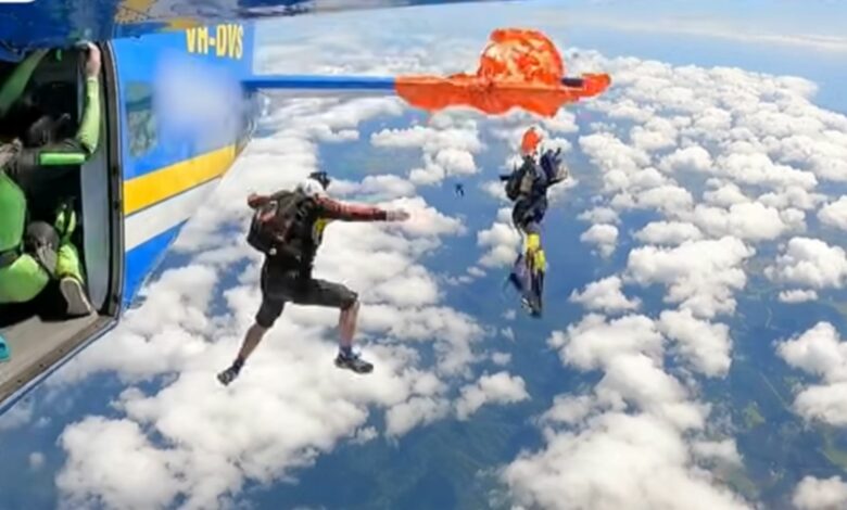 Το βίντεο, που έφερε στη δημοσιότητα το Γραφείο Ασφάλειας Μεταφορών της Αυστραλίας, δείχνει το εφεδρικό αλεξίπτωτο του χρήστη να ανοίγει κατά λάθος και να τυλίγεται στο φτερό του αεροπλάνου, αφήνοντάς τον να αιωρείται στο κενό.