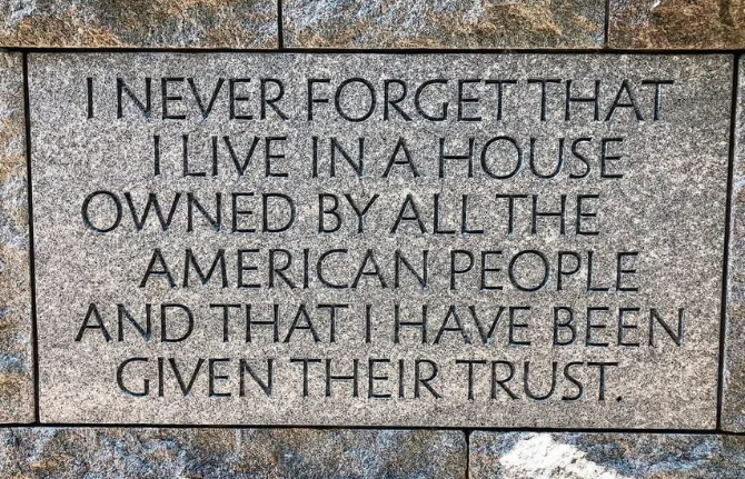 Σημειώνεται ότι στην κατεδαφισμένη Ανατολική Πτέρυγα υπήρχε πλάκα που έγραφε ότι «δεν θα ξεχάσω ποτέ ότι ζω σε ένα σπίτι που ανήκει σε όλους τους Αμερικανούς πολίτες και ότι έχω λάβει την εμπιστοσύνη τους». Η πλάκα αυτή δεν υπάρχει πια…
