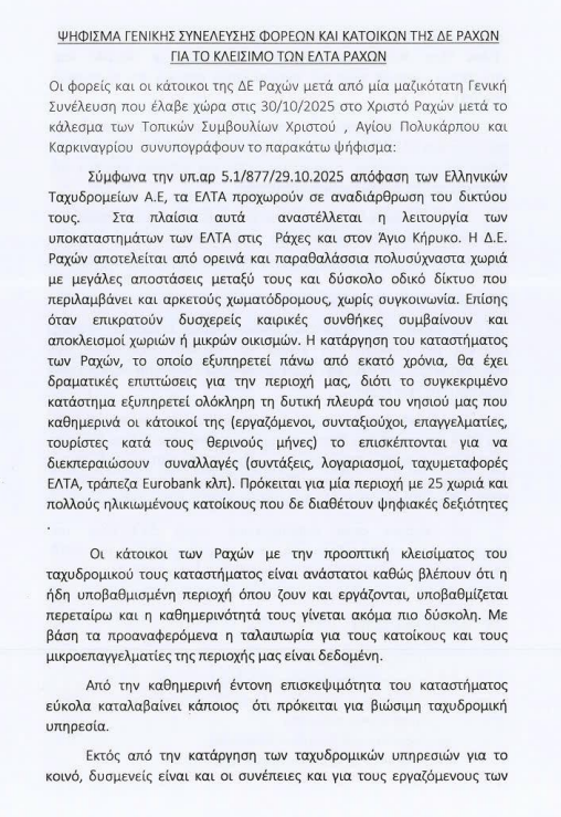 Το ψήφισμα της Γενικής Συνέλευσης φορέων και κατοίκων της ΔΕ Ραχών: