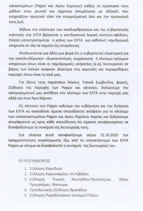 Η Ικαρία διαθέτει δύο ΕΛΤΑ: ένα αυτό στις Ράχες κι άλλο ένα στον Αγιο Κηρύκο, το οποίο επίσης κλείνει και έτσι το νησί θα μείνει με τα ΕΛΤΑ Ευδήλου που βρίσκονται πολλά χιλιόμετρα, χωρίς να υπάρχουν μέσα μαζικής μεταφοράς στο νησί.