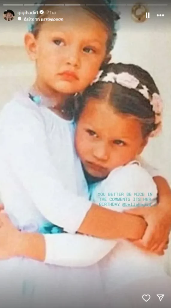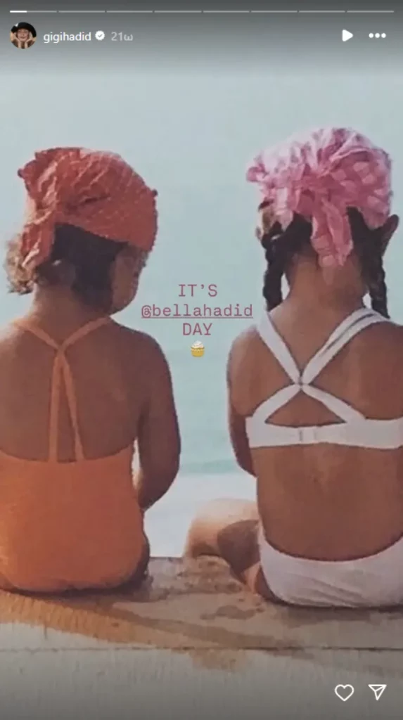 Πάνω στα στιγμιότυπα, με αφορμή τα γενέθλια της Μπέλα Χαντίντ, η Τζίτζι έγραψε:«Είναι η μέρα της Μπέλα. Είναι η κινούμενη “καρδιά” μας. Θα σε προστατεύω με κάθε κόστος. Το καλό που σου θέλω να είσαι ευγενικός στα σχόλια γιατί είναι τα γενέθλιά της. Είναι η πιο αγαπητή θεία. Χρόνια πολλά. Σε αγαπάω τόσο πολύ».