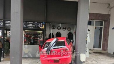 Λαμία: Αυτοκίνητο γλίστρησε και καρφώθηκε σε βιτρίνα μαγαζιού (Photos)