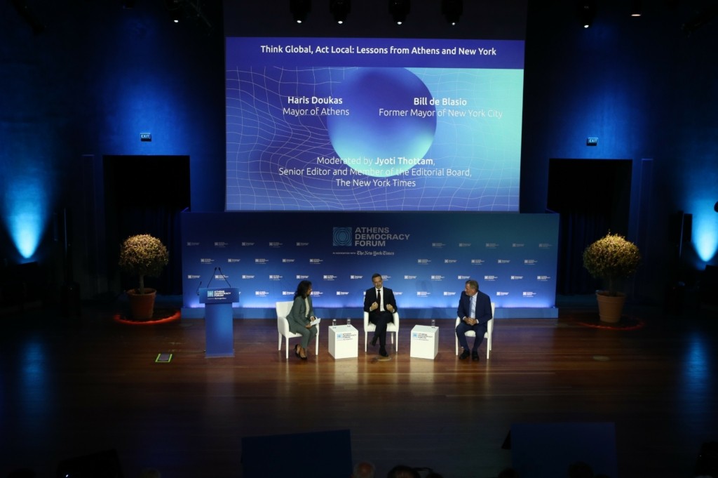 Οι κοινές προκλήσεις που αντιμετωπίζουν Αθήνα και Νέα Υόρκη και η ανάγκη μιας ισχυρής τοπικής φωνής απέναντι σε κεντρικές πολιτικές αποφάσεις, αναδείχθηκε στη διάρκεια συζήτησης μεταξύ του δημάρχου Αθηναίων Χάρη Δούκα και του επί οκτώ χρόνια δημάρχου της Νέας Υόρκης, Μπιλ ντε Μπλάζιο (Bill de Blasio), με τίτλο «Think Global, Act Local: Lessons from Athens and New York», που διεξήχθη χθες, στο Ωδείο Αθηνών, στο πλαίσιο του Athens Democracy Forum.
