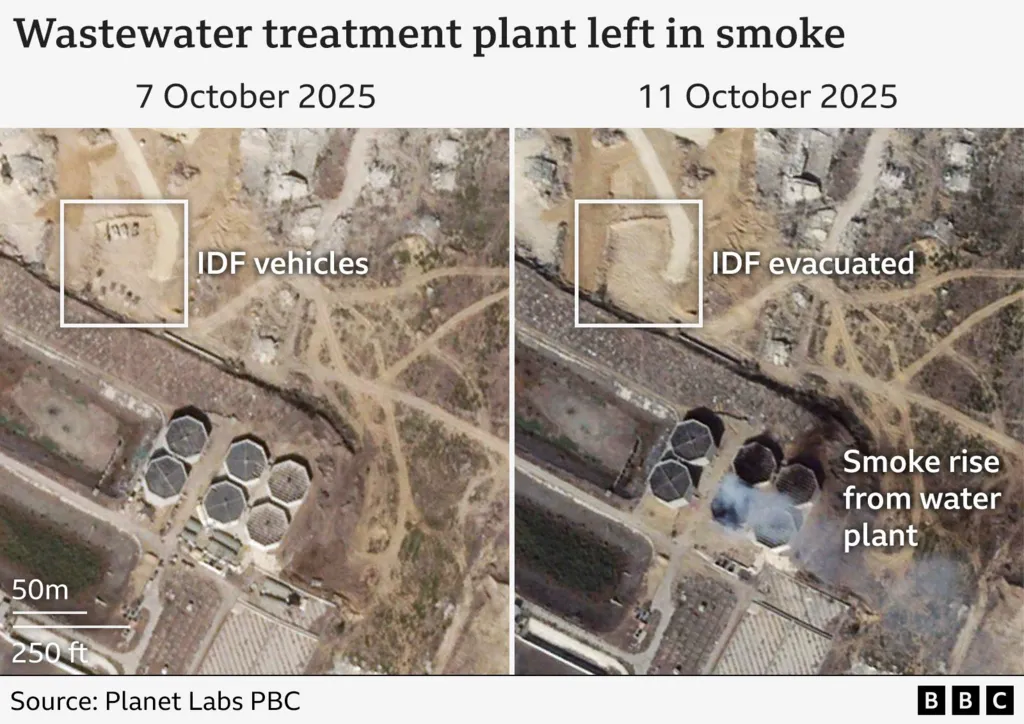 Μετά την εκεχειρία, ισραηλινοί στρατιώτες φωτογραφήθηκαν μπροστά σε ένα εργοστάσιο επεξεργασίας λυμάτων στην Πόλη της Γάζας που είχε πυρποληθεί λίγο πριν αποσυρθεί ο στρατός από τη θέση κοντά σε αυτή την υποδομή.