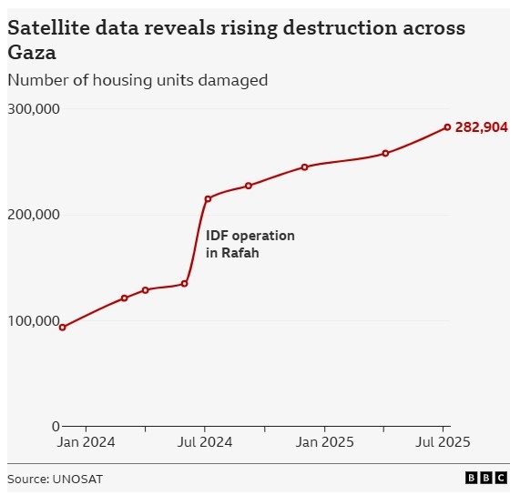 Το UNOSAT εκτιμά ότι 282.904 σπίτια και διαμερίσματα σε όλη τη Γάζα έχουν καταστραφεί ή υποστεί ζημιές – και ο αριθμός πιθανότατα είναι υποτιμημένος, καθώς δεν περιλαμβάνει τις πιο πρόσφατες επιχειρήσεις.