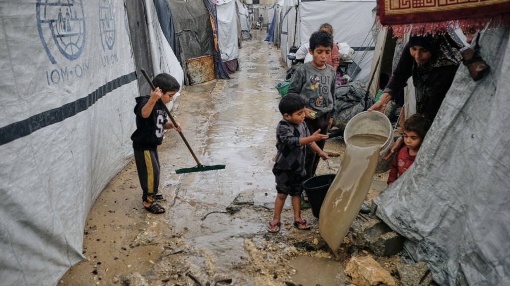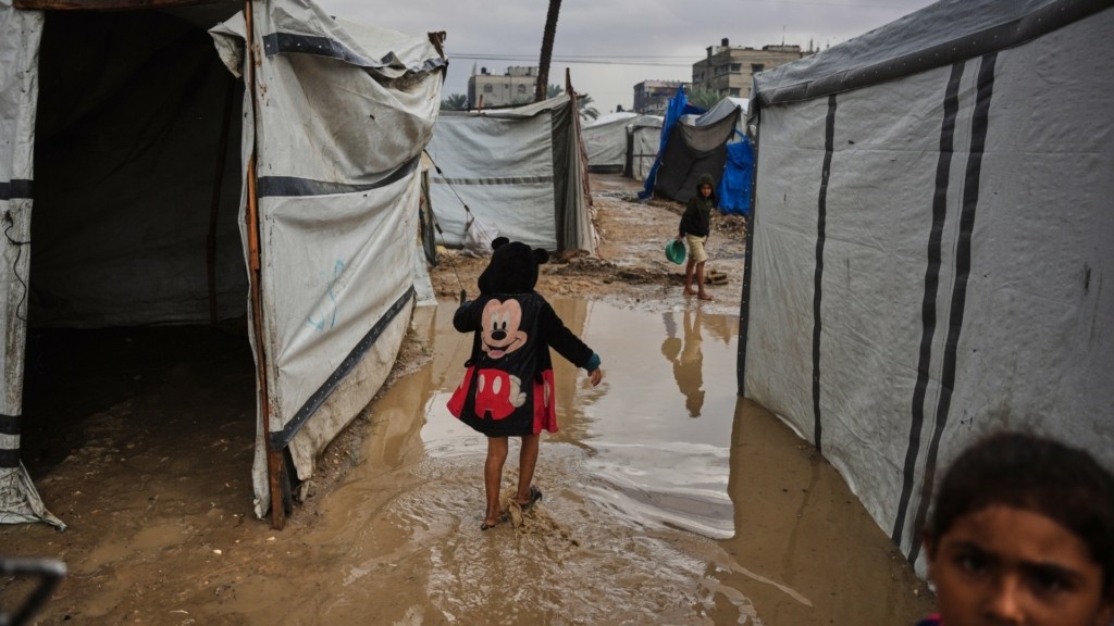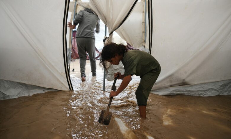 Με τις πρώτες καταρρακτώδεις βροχές οι σκηνές των Παλαιστινίων πλημμύρισαν. «Όλες οι σκηνές καταστράφηκαν. Πού είναι η Χαμάς;» είπε χαρακτηριστικά η Assmaa Fayad, της οποίας το πρόχειρο καταφύγιο έχει υποστεί ζημιές από τις έντονες βροχοπτώσεις.