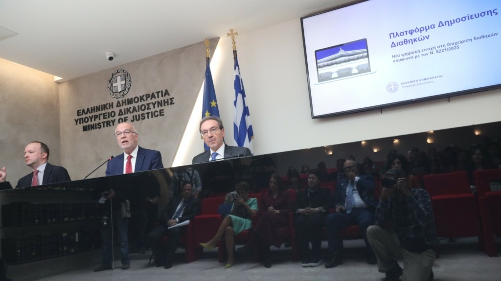 Στο υπουργείο Δικαιοσύνης παρουσιάστηκε η πλατφόρμα της δημοσίευσης των διαθηκών στον Συμβολαιογραφικό Σύλλογο Αθηνών, Πειραιώς, Αιγαίου και Δωδεκανήσου, κάτι που έχει ως συνέπεια ο χρόνος δημοσίευσης των διαθηκών να μειώνεται από τις 400 μέρες που απαιτούνται σήμερα, μέσω των δικαστηρίων, σε 3 έως 7 ημέρες μέσω της πλατφόρμας diathikes.gr.