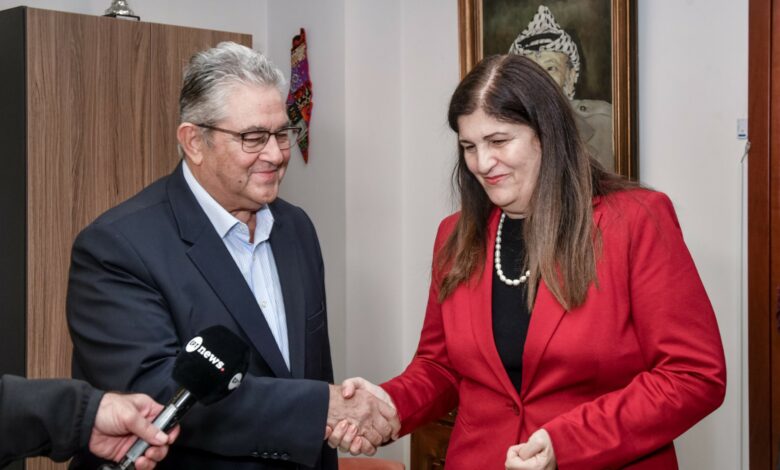 Συνάντηση με την υπουργό Εξωτερικών της Παλαιστινιακής Αρχής, Βαρσέν Αγαπεκιάν Σαχίν, είχε σήμερα ο ΓΓ της ΚΕ του ΚΚΕ, Δημήτρης Κουτσούμπας, στην πρεσβεία της Παλαιστίνης.