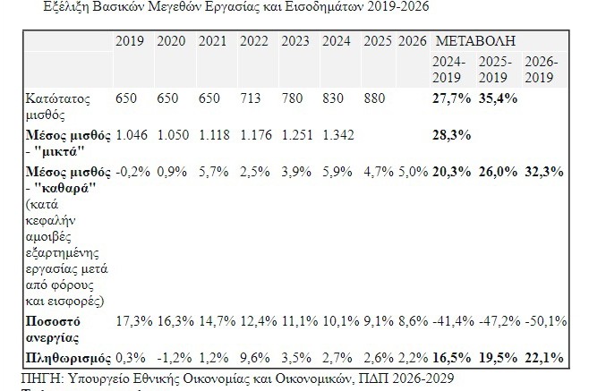 Σύμφωνα με τα στοιχεία του ΠΔΠ, σε σχέση με φέτος, το 2026 αναμένεται αύξηση 5% στις «καθαρές» από φόρους και εισφορές μέσες αμοιβές εξαρτημένης εργασίας, σε σχέση με το 2025, άνοδος υπερδιπλάσια από την αύξηση του πληθωρισμού που αναμένεται να μην ξεπεράσει το 2,2%.