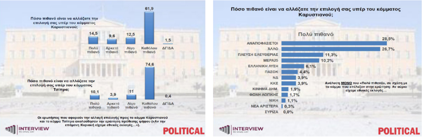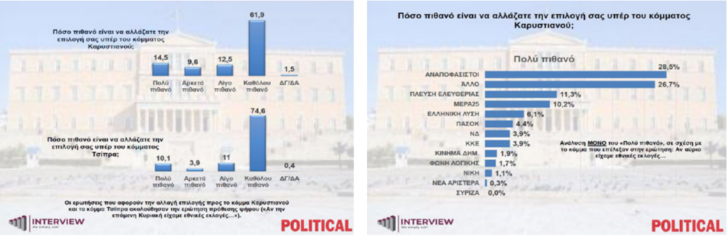 Τα πράγματα αλλάζουν όταν στην πολιτική συνάρτηση μπαίνουν τα κόμματα Καρυστιανού και Τσίπρα: πιθανό κόμμα υπό τη Μαρία Καρυστιανού αντλεί στήριξη κυρίως από τους αναποφάσιστους (28,5%) και σε μικρότερο βαθμό από την Πλεύση Ελευθερίας, το ΜέΡΑ25 και την Ελληνική Λύση. Το 14,5% δηλώνει ότι είναι «πολύ πιθανό» να το ψηφίσει. Αντίθετα, ένα νέο κόμμα υπό τον Αλέξη Τσίπρα φαίνεται να πλήττει πρωτίστως τον ΣΥΡΙΖΑ, καθώς το 27% των ψηφοφόρων του δηλώνει έτοιμο να μετακινηθεί. Το συνολικό ενδιαφέρον παραμένει χαμηλότερο, με 10,1% να δηλώνει «πολύ πιθανό» να το στηρίξει.