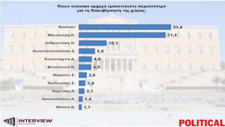 Στην ερώτηση «ποιον πολιτικό αρχηγό εμπιστεύεστε περισσότερο για τη διακυβέρνηση της χώρας», η δημοφιλία του πρωθυπουργού Κυριάκου Μητσοτάκη εμφανίζεται αυξημένη σε σχέση με την προηγούμενη μέτρηση της Interview. Συγκεκριμένα, το 33,4% απαντά «κανέναν», το 31,4% τον Κυριάκο Μητσοτάκη, το 10,1% τον Νίκο Ανδρουλάκη, το 5,9% τη Ζωή Κωνσταντοπούλου, το 4,8% τον Δημήτρη Κουτσούμπα, το 4,5% τον Κυριάκο Βελόπουλο, το 2,9% τον Σωκράτη Φάμελλο, το 2,4% τον Στέφανο Κασσελάκη, το 2,1% τον Αλέξη Χαρίτση, το 1,4% την Αφροδίτη Λατινοπούλου και το 1,1% τον Δημήτρη Νατσιό.
