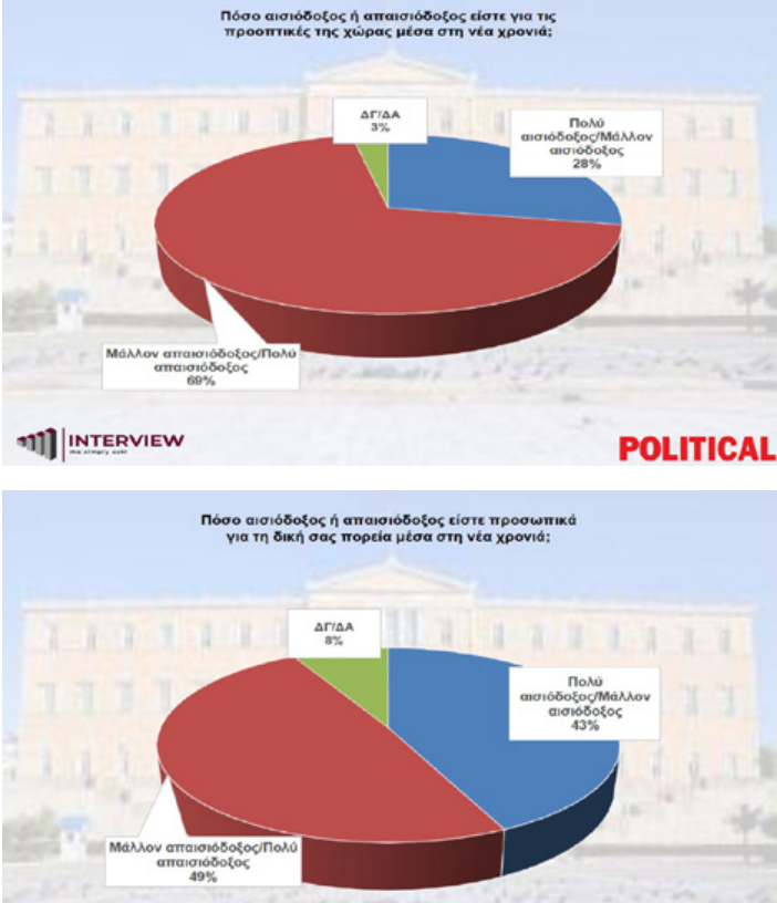 Όσον αφορά στην πορεία της χώρας, η συντριπτική πλειονότητα των ερωτηθέντων εμφανίζεται απαισιόδοξη για τις προοπτικές της χώρας το 2026, αλλά λιγότερο απαισιόδοξη έως αισιόδοξη για τα προσωπικά οικονομικά της. Συγκεκριμένα, στο ερώτημα «πόσο αισιόδοξος ή απαισιόδοξος είστε για τις προοπτικές της χώρας μέσα στη νέα χρονιά», το 69% δηλώνει μάλλον απαισιόδοξος/πολύ απαισιόδοξος, το 28% πολύ αισιόδοξος/μάλλον αισιόδοξος και 3% ΔΞ/ΔΑ. Στο ερώτημα, «πόσο αισιόδοξος ή απαισιόδοξος είστε προσωπικά για τη δική σας πορεία μέσα στη νέα χρονιά», μάλλον απαισιόδοξος/πολύ απαισιόδοξος δηλώνει το 49%, πολύ αισιόδοξος/μάλλον αισιόδοξος το 43% και 8% ΔΞ/ΔΑ.