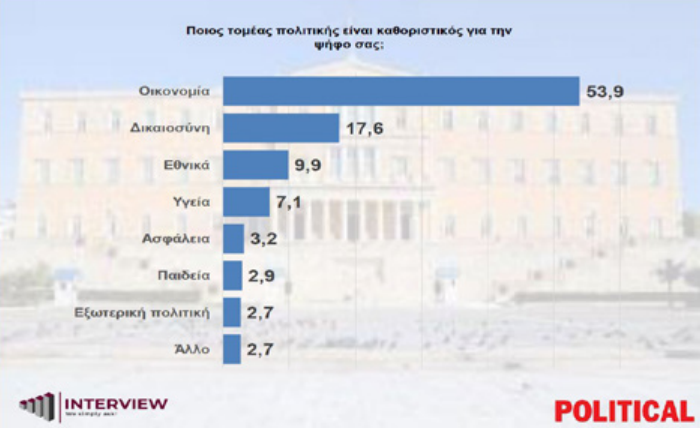 Και σε αυτήν τη δημοσκόπηση της Interview, η οικονομία αναδεικνύεται σε καθοριστικότερο παράγοντα για την ψήφο των πολιτών. Συγκεκριμένα, το 53,9% των ερωτηθέντων απαντά η οικονομία και ακολουθούν η δικαιοσύνη με 17,6%, τα εθνικά με 9,9%, η υγεία με 7,1%, η ασφάλεια με 3,2%, η παιδεία με 2,9%, η εξωτερική πολιτική με 2,7% και άλλο με 2,7%.