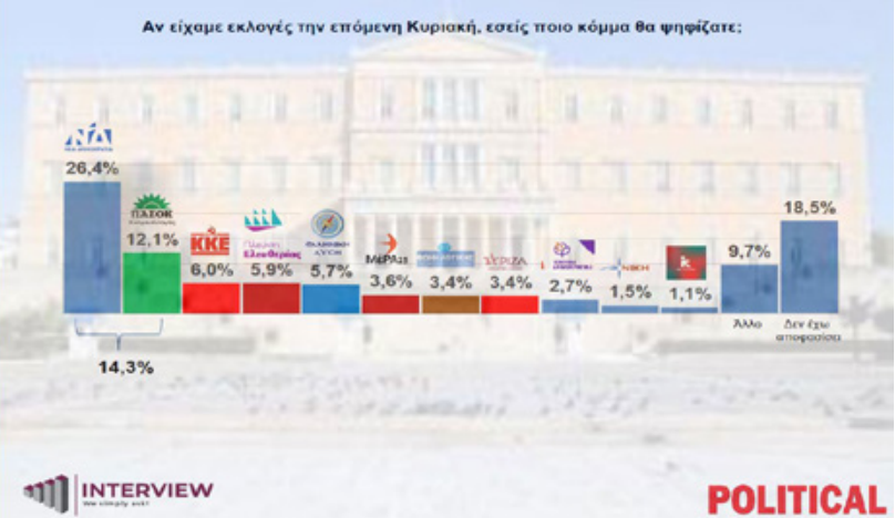 Αρχίζοντας από τα… υπαρκτά κόμματα, στην πρόθεση ψήφου η Νέα Δημοκρατία συγκεντρώνει 26,4%, αυξημένη κατά 2,8 μονάδες σε σχέση με τον Δεκέμβριο. Ακολουθούν το ΠΑΣΟΚ με 12,1%, το ΚΚΕ με 6%, η Πλεύση Ελευθερίας με 5,9%, η Ελληνική Λύση με 5,7% και το ΜέΡΑ25 με 3,6%. Ο ΣΥΡΙΖΑ καταγράφεται μόλις στο 3,4%, ισοψηφώντας με τη Φωνή Λογικής, ενώ το Κίνημα Δημοκρατίας λαμβάνει 2,7%. Οι αναποφάσιστοι ανέρχονται στο ιδιαίτερα υψηλό 18,5%, στοιχείο που αποτυπώνει τη ρευστότητα του πολιτικού σκηνικού.