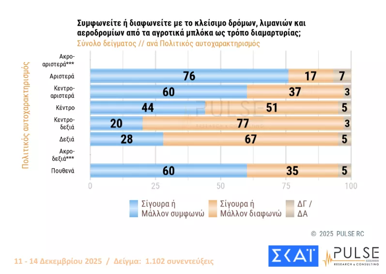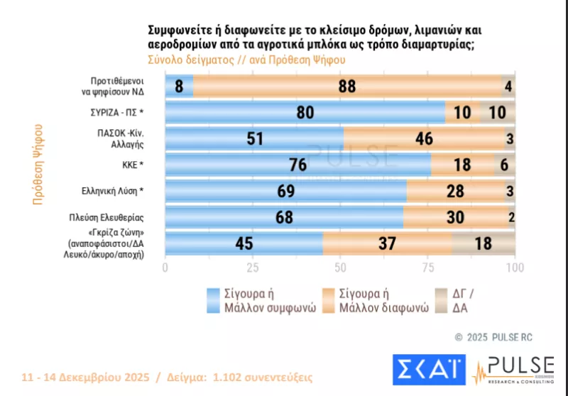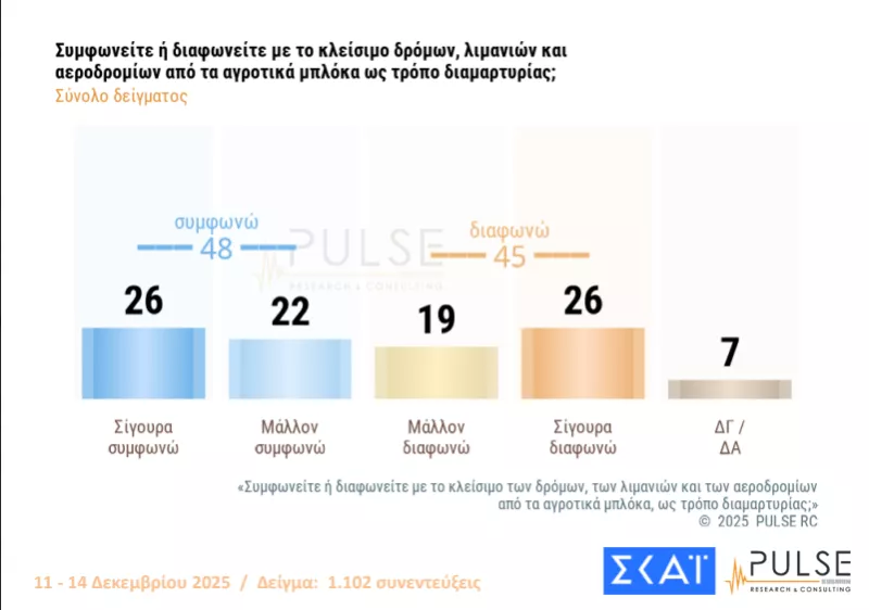 Σε σχέση με το αγροτικό η δημοσκόπηση της Pulse δείχνει ότι η πλειοψηφία των πολιτών συμφωνεί με τα αιτήματα των αγροτών. Ωστόσο, τα ποσοστά είναι χαμηλότερα και σχεδόν μοιρασμένα σε ό,τι αφορά το κλείσιμο δρόμων, λιμανιών και αεροδρομίων.