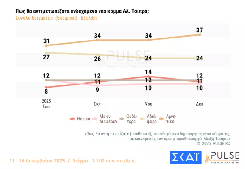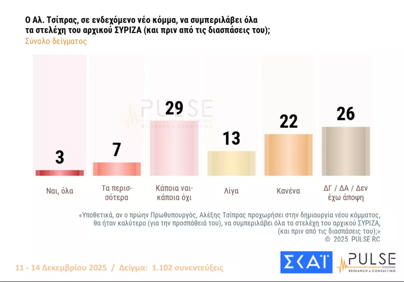 Το «κόμμα» Τσίπρα, αν και παρουσιάζει καθοδική πορεία σε σχέση με την προηγούμενη μέτρηση της Pulse, καταγράφει σημαντικές μετρήσεις, καθώς το 21% βλέπει «θετικά» ή «με ενδιαφέρον» τη σύστασή του, ενώ υπάρχει ένα ακόμα 12% που το αντιμετωπίζει «ουδέτερα».