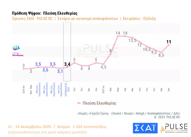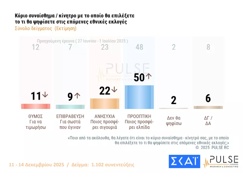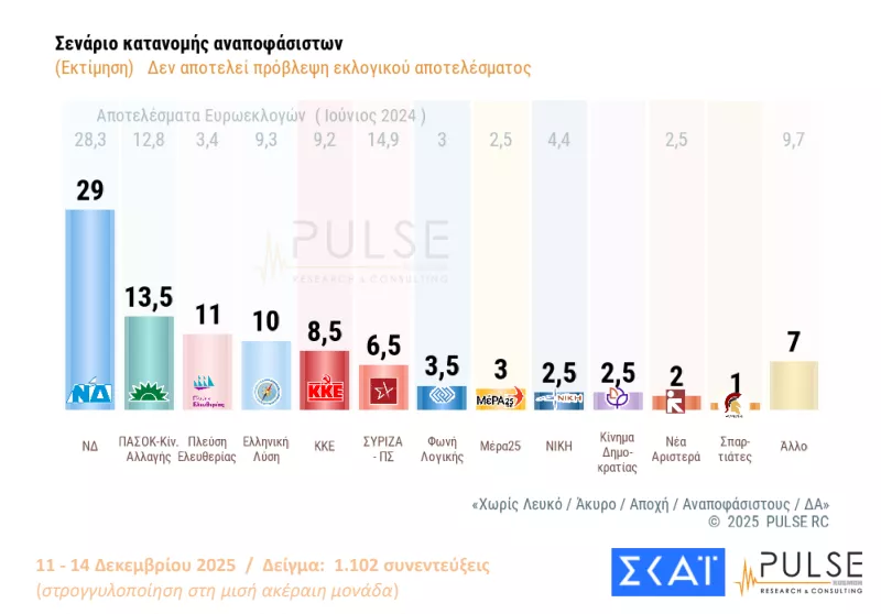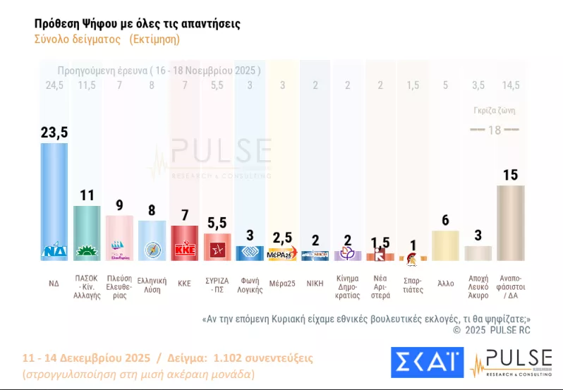 Στην πρόθεση ψήφου, η Νέα Δημοκρατία χάνει μία ποσοστιαία μονάδα, σε σύγκριση με τη δημοσκόπηση της Pulse τον Νοέμβριο.