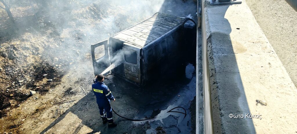 Μερικές εκατοντάδες μέτρα πιο μακριά, το βαν που εμπλέκεται στην υπόθεση, βρέθηκε φλεγόμενο, ενώ αναζητείται ο οδηγός της μηχανής.