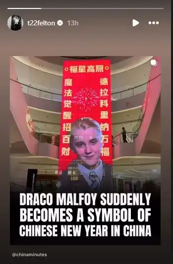Η «μανία Malfoy» δεν πέρασε απαρατήρητη ούτε από τον ίδιο τον Tom Felton, ο οποίος αναδημοσίευσε story στο Instagram που ανέφερε πως ο χαρακτήρας του έχει γίνει «σύμβολο της κινεζικής Πρωτοχρονιάς στην Κίνα». Η αντίδρασή του έδωσε ακόμη μεγαλύτερη ώθηση στο trend, με τους fans να τον αποθεώνουν και να τον χαρακτηρίζουν «100% ξεκαρδιστικό».