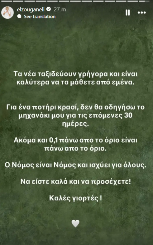 «Τα νέα ταξιδεύουν γρήγορα και είναι καλύτερα να τα μάθετε από εμένα. Για ένα ποτήρι κρασί, δεν θα οδηγήσω το μηχανάκι μου για τις επόμενες 30 ημέρες. Ακόμα και 0,1 πάνω από το όριο είναι πάνω από το όριο. Νόμος είναι Νόμος και ισχύει για όλους. Να είστε καλά και να προσέχετε! Καλές γιορτές!» είχε γράψει η ίδια σε story της μετά το περιστατικό.