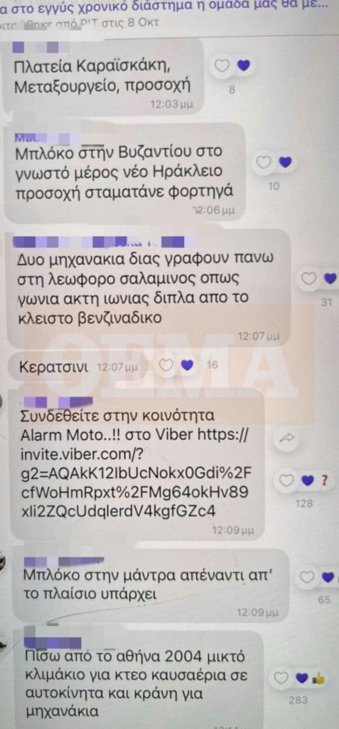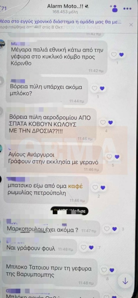 Το φως της δημοσιότητας είδαν τα μηνύματα που αντάλλασσαν τα μέλη του group με όνομα «Alarm moto», προκειμένου να ενημερώνουν για τη διενέργεια αστυνομικών ελέγχων.