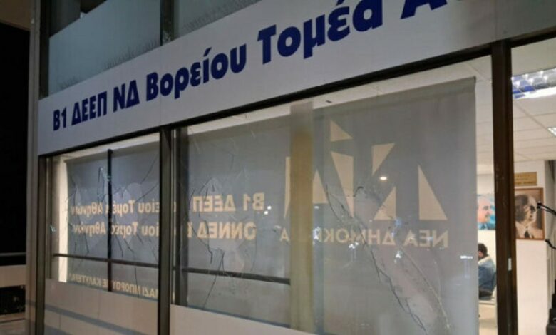 Άγνωστοι πέταξαν αντικείμενα και έσπασαν την τζαμαρία στα γραφεία της Νέας Δημοκρατίας στην Πεύκη.