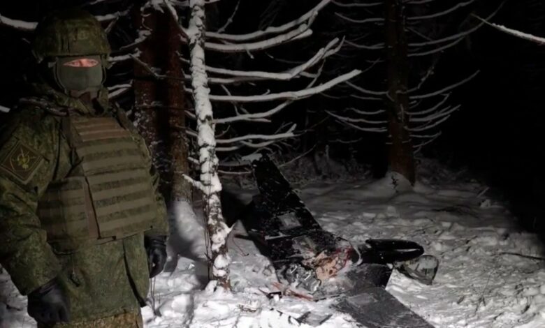 Το ρωσικό υπουργείο Αμυνας δημοσίευσε βίντεο που δείχνει έναν στρατιώτη με κρυμμένο το πρόσωπο δίπλα σε συντρίμμια ενός drone και έναν χάρτη που υποτίθεται ότι δείχνει την πορεία των drones κατά την διάρκεια της επίθεσης για την οποία η Μόσχα κατηγορεί το Κίεβο.
