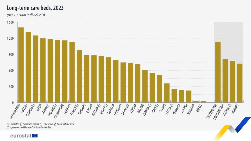 Συγκριτικά με τις 26 χώρες για τις οποίες υπάρχουν διαθέσιμα στοιχεία, το 2023, τα υψηλότερα ποσοστά καταγράφηκαν στην Ολλανδία που διαθέτει 1.400 κλίνες μακροχρόνιας φροντίδας ανά 100.000 πληθυσμού), τη Σουηδία που κατέγραψε 1.315 κλίνες μακροχρόνιας φροντίδας και το Βέλγιο 1.250 κλίνες.