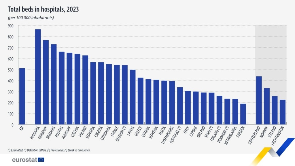 Αντίθετα, 7 χώρες της ΕΕ είχαν λιγότερες από 300 νοσοκομειακές κλίνες ανά 100.000 πληθυσμού, σημειώνοντας τις χαμηλότερες αναλογίες.