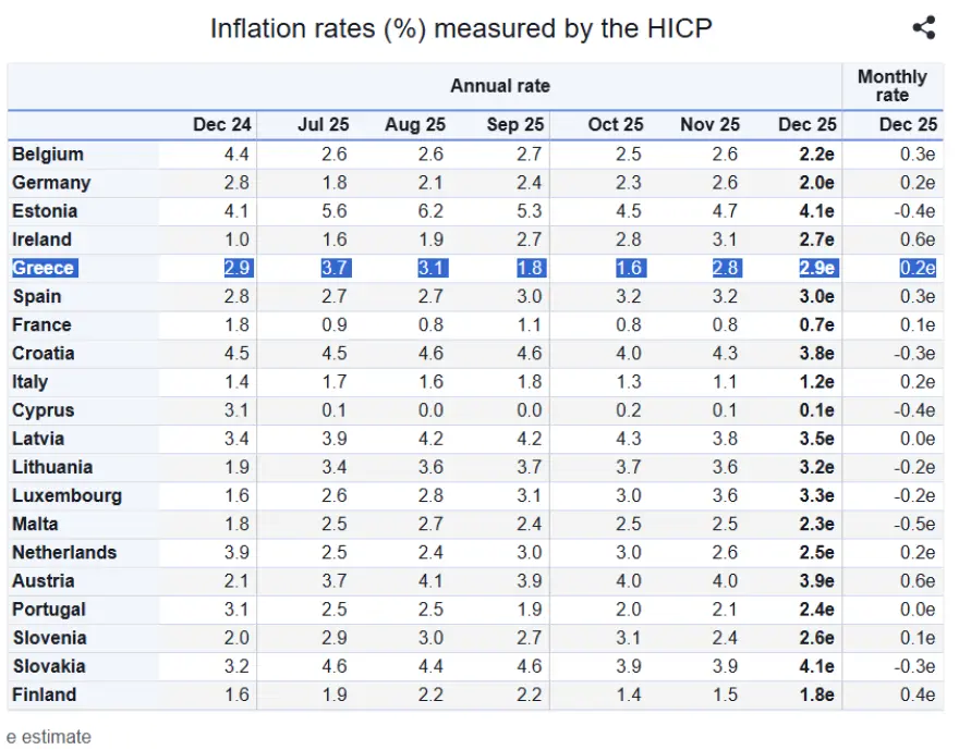 Eurostat: Στο 2,9% ο πληθωρισμός στην Ελλάδα το Δεκέμβριο, στο 2% στην Ευρωζώνη
