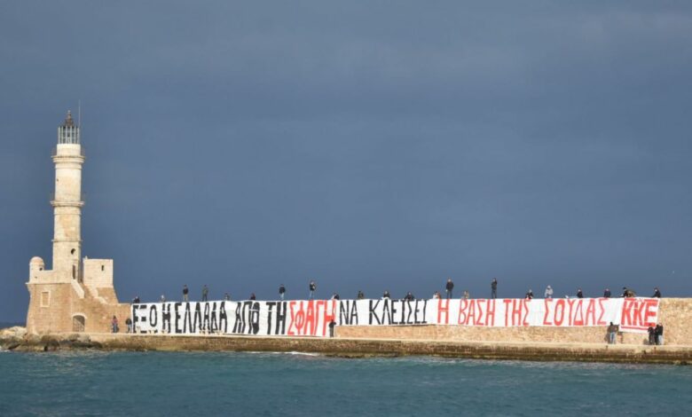 «Έξω η Ελλάδα από τη σφαγή»: Γιγάντιο πανό του ΚΚΕ στο παλιό λιμάνι των Χανίων
