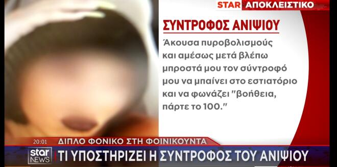 «Άκουσα πυροβολισμούς και αμέσως μετά βλέπω μπροστά μου τον σύντροφό μου να μπαίνει στο εστιατόριο και να φωνάζει: «”Βοήθεια πάρτε το 100″», ανέφερε η σύντροφος του ανιψιού. «Μετά έπεσε μπροστά μου και είπε: “Έχουν πέσει πυροβολισμοί. Είναι νεκροί”», υπογράμμισε. «Ο σύντροφός μου ήταν σε σοκ δεν μπορούσε να μιλήσει», σημείωσε η σύντροφος του ανιψιού.