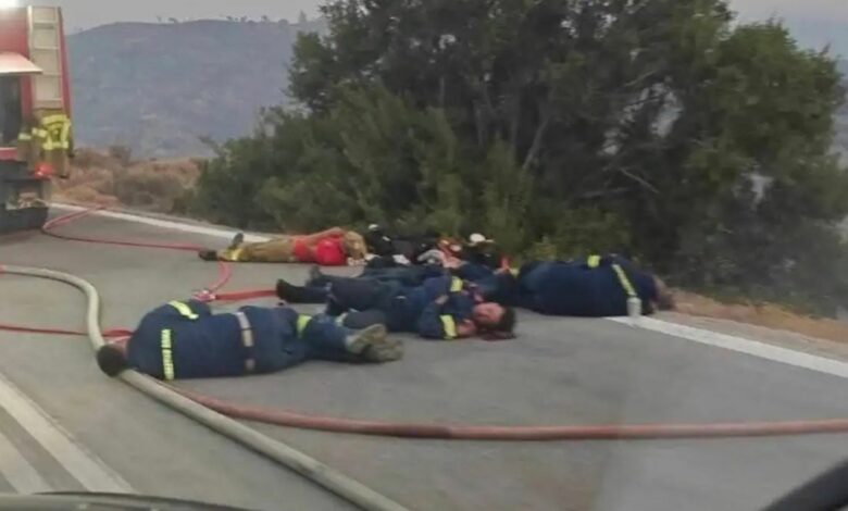 Φωτιά στη Χίο: Συγκλονιστική φωτογραφία – Εξαντλημένοι πυροσβέστες κοιμούνται στη μέση του δρόμου