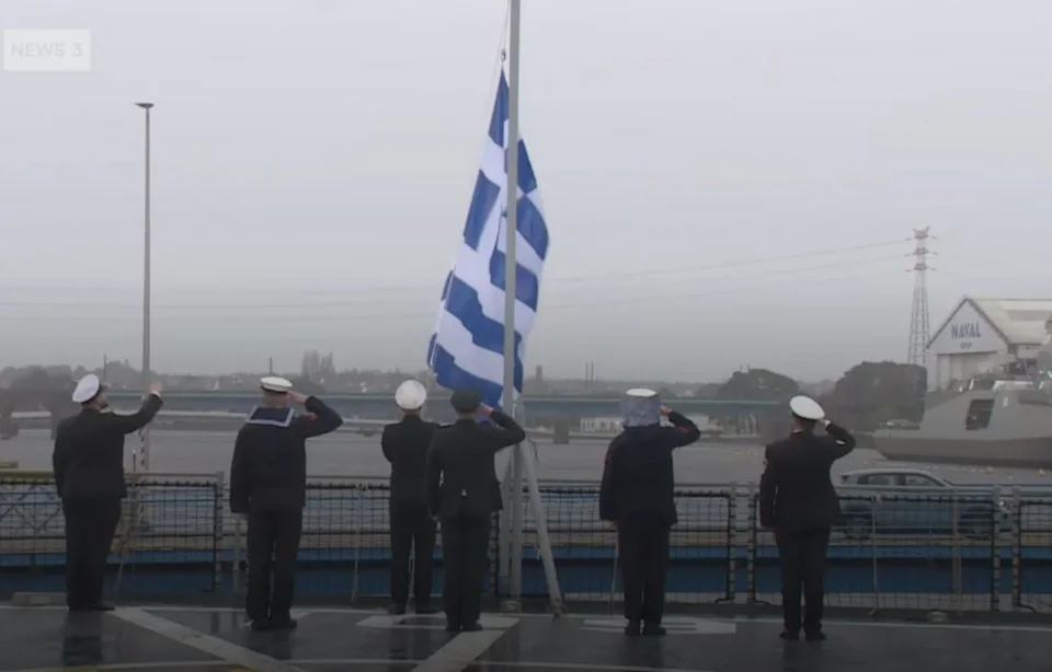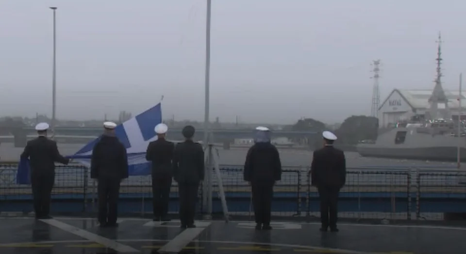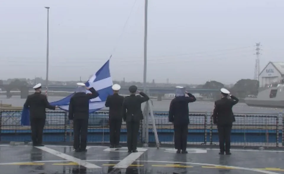 Αφού ακούστηκε το όνομα της φρεγάτας υψώθηκε η ελληνική σημαία στην πρύμνη του καραβιού, ακολούθησε και η επιβίβαση των 128 στελεχών, μελών του πληρώματος.