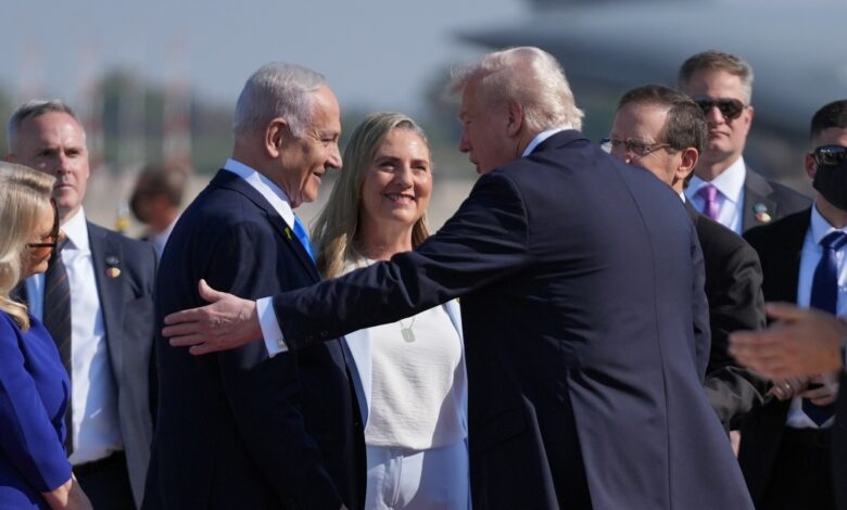 Στο αεροδρόμιο τον Τραμπ υποδέχθηκε ο Ισραηλινός ομόλογός του, Ιζάκ Χέρτζογκ, και ο πρωθυπουργός, Μπένιαμιν Νετανιάχου, καθώς και η διαπραγματευτική ομάδα των ΗΠΑ (Στιβ Γουίτκοφ, Μάικ Χάκαμπι, Τζάρεντ Κούσνερ και Ιβάνκα Τραμπ). Ο Τραμπ θα μεταβεί στο Σαρμ ελ Σέικ της Αιγύπτου, όπου θα πραγματοποιηθεί ευρεία σύνοδος για την ειρήνευση στη Γάζα και θα εξεταστούν τα επόμενα βήματα για την υλοποίηση του σχεδίου του Αμερικανού προέδρου.