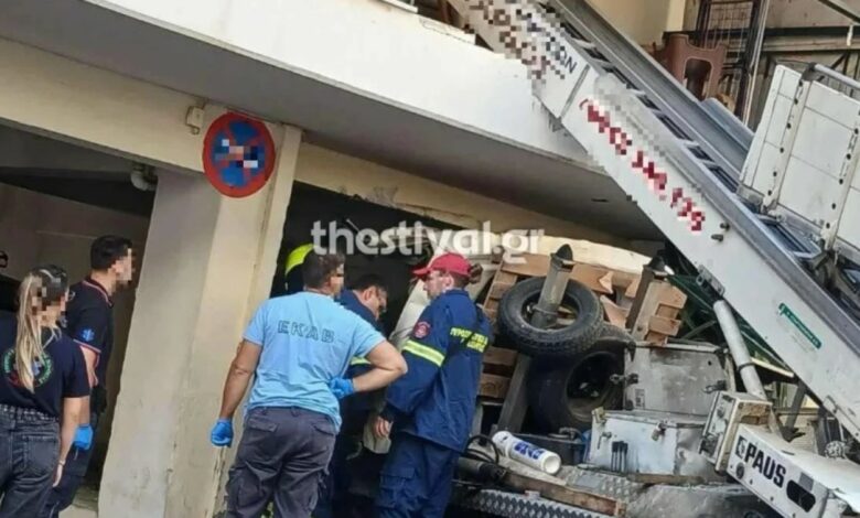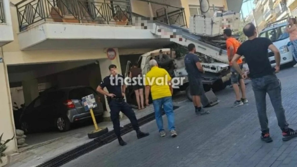 Ατύχημα σημειώθηκε το απόγευμα της περασμένης Δευτέρας στην περιοχή των Συκεών στη Θεσσαλονίκη όταν ένα γερανοφόρο όχημα εισήλθε σε πιλοτή πολυκατοικίας και ο γερανός έπεσε στο μπαλκόνι του πρώτου ορόφου.