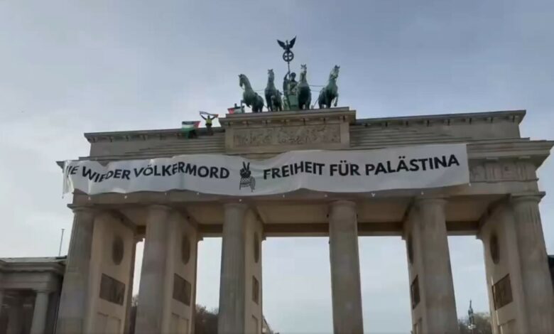 Μήνυμα κατά της γενοκτονίας στην Παλαιστίνη έστειλαν ακτιβιστές στη Γερμανία, οι οποίοι χρησιμοποίησαν ανυψωτικό μηχάνημα για να κρεμάσουν ένα πανό στη Πύλη του Βρανδεμβούργου στο Βερολίνο.
